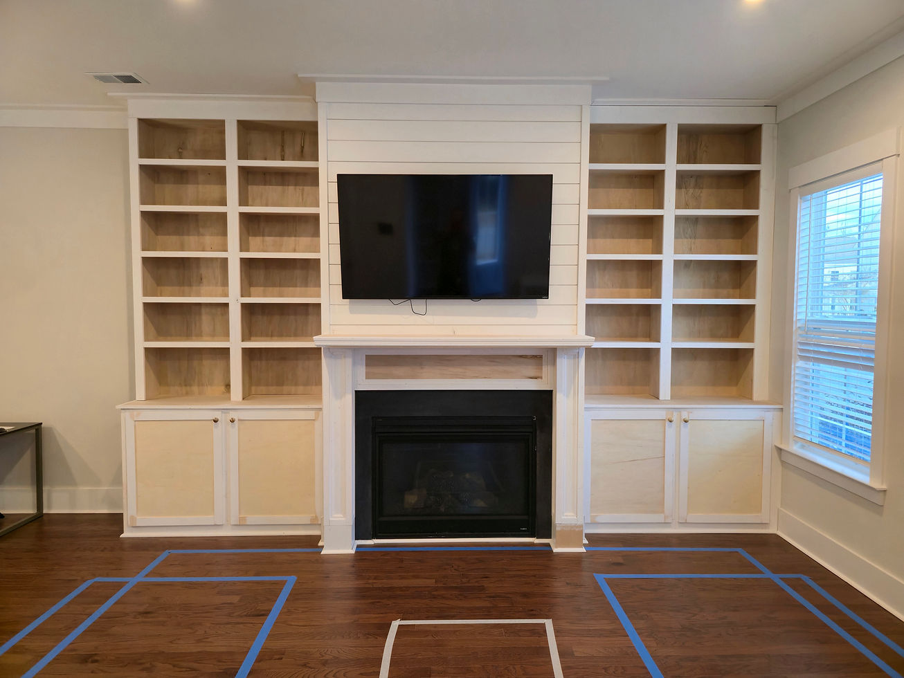 We designed and installed full-height custom built-in bookcases on both sides of the fireplace, paired with a custom fireplace mantel and shiplap surround. The finished result creates a strong focal point, adds substantial storage, and brings a clean, timeless look to the room.